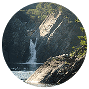 巨大な花崗岩の一枚岩からV字谷に流れ落ちる落差60mの滝。展望台から眺めるとそのスケールに圧倒される。